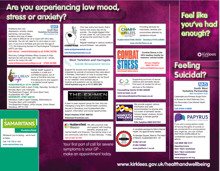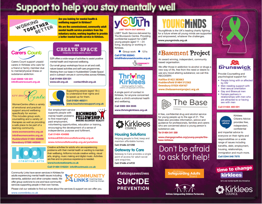 If you are experiencing mental health problems or need urgent help, there are many resources available and there is plenty of support within your reach. Here are many mental health services in Kirklees that can provide support for you.